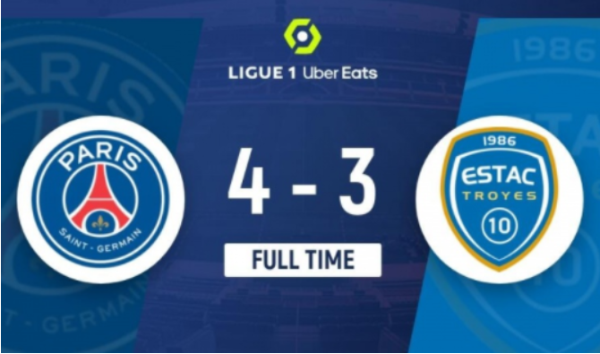 全场比赛结束,巴黎圣日耳曼4-3特鲁瓦。