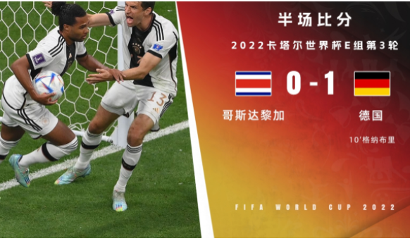 北京时间12月2日03:00,卡塔尔世界杯小组赛E组哥斯达黎加迎战德国的比赛,上半场劳姆助攻格纳布里先拔头筹,弗勒尔失单刀,半场结束,德国1-0哥斯达黎加。