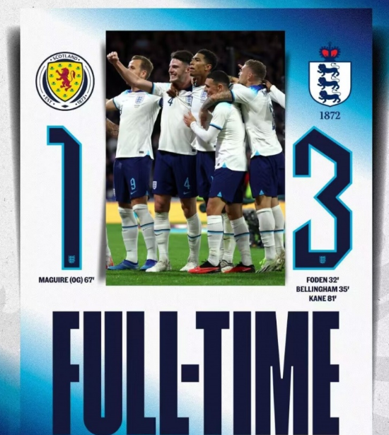 北京时间9月13日02:45,国际友谊赛苏格兰对阵英格兰的比赛,上半场沃克助攻福登破门,贝林厄姆推射扩大比分,下半场马奎尔替补上场打进乌龙球,凯恩低射破门,最终英格兰3-1苏格兰。