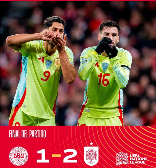 直播侠11月16日讯 欧国联A4组第5轮,西班牙客战丹麦。上半场,阿约泽中框,奥亚萨瓦尔首开纪录。易边再战,阿约泽建功本场传射,法比安回传失误送大礼,伊萨克森笑纳空门。最终西班牙2-1客胜丹麦。积分榜方面,西班牙6分领跑锁定头名。